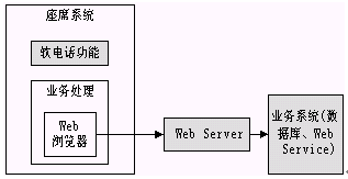 從上圖可以看出,座席端所有的業(yè)務處理都是在Web瀏覽器上進行的,所以無論是利用原有系統(tǒng)還是新開發(fā)系統(tǒng),用戶都不必要關(guān)心座席的具體實現(xiàn)方式,要做的僅僅是編寫新的JSP,ASP等可訪問后臺業(yè)務的Web頁面,然后進行簡單的配置就可以完成業(yè)務的擴充功能。