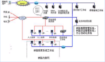 鐵路客戶服務(wù)中心系統(tǒng)主要是由帶語音板卡的計算機或排隊交換機、CTI服務(wù)器、IVR服務(wù)器、應(yīng)用服務(wù)器/數(shù)據(jù)庫服務(wù)器、人工座席系統(tǒng)等硬件設(shè)備和應(yīng)用軟件組成。它以電話服務(wù)為主要服務(wù)方式、結(jié)合計算機信息系統(tǒng)的資料數(shù)據(jù),為客戶提供全方位的服務(wù),包括業(yè)務(wù)查詢、業(yè)務(wù)咨詢、業(yè)務(wù)受理、投訴和建議、市場調(diào)查等功能。