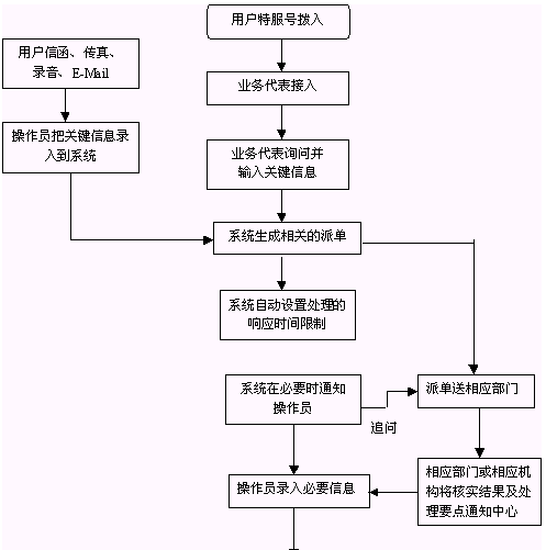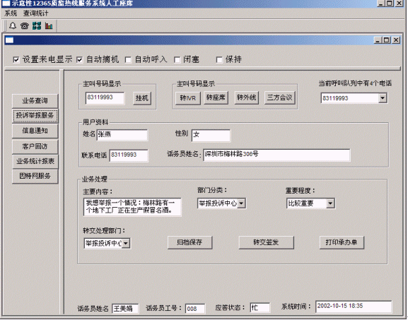 人民群眾打入電話后,當(dāng)系統(tǒng)的自動語音應(yīng)答子系統(tǒng)無法解決客戶問題時,客戶可選擇人工服務(wù),由企業(yè)客戶服務(wù)代表直接接聽客戶電話,處理并解決客戶問題。此時客戶同座席話務(wù)人員直接溝通,并同時記錄下該客戶的聯(lián)系方式,將相關(guān)數(shù)據(jù)添加入系統(tǒng)數(shù)據(jù)庫;也可以在數(shù)據(jù)庫的支持下回答質(zhì)量監(jiān)督咨詢、投訴等?蛻粢部梢赃x擇自動語音服務(wù)方式,根據(jù)系統(tǒng)的語音提示輸入按鍵,選擇類別,將自己的投訴和建議以及自己的聯(lián)系方式信息以留言錄音的方式保存在系統(tǒng)中。系統(tǒng)同時還支持自動傳真方式,客戶可以通過傳真機進入本系統(tǒng),通過按鍵選擇傳真方式,將自己的意見建議等的文本內(nèi)容傳真給系統(tǒng),系統(tǒng)自動接受并存入數(shù)據(jù)庫。