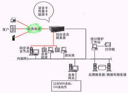 本系統(tǒng)物理結(jié)構(gòu)由帶語音板卡的高性能工控機(稱為綜合語音服務(wù)器,在功能上可以分為CTI服務(wù)器、IVR(交互式語音應(yīng)答)/IFR服務(wù)器、統(tǒng)計維護管理工作站、數(shù)據(jù)庫/應(yīng)用服務(wù)器、錄音留言工作站、業(yè)務(wù)網(wǎng)關(guān)服務(wù)器、業(yè)務(wù)代表座席、網(wǎng)絡(luò)系統(tǒng)等和應(yīng)用軟件構(gòu)成。