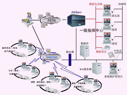 該熱線系統(tǒng)能與Internet、數(shù)據(jù)庫系統(tǒng)很好地集成,實現(xiàn)城市各級部門之間數(shù)據(jù)共享和各種其它不同的業(yè)務(wù)功能,以建設(shè)部為中心、各職能聯(lián)動2級網(wǎng)絡(luò)系統(tǒng)和搶修維護(hù)服務(wù)端三個部分組成,利用AltiCenter基于IP的分布式呼叫中心技術(shù),可以實現(xiàn)建設(shè)部12319服務(wù)中心,屬下各個職能部門建立異地分中心,利用現(xiàn)有的PSTN電話網(wǎng)/INTERNET互聯(lián)網(wǎng),將1,2,3級網(wǎng)絡(luò)組成一個集語音和數(shù)據(jù)傳輸為一體的多媒體網(wǎng)絡(luò)系統(tǒng),并提供對任何方式的服務(wù)進(jìn)行全程錄音、質(zhì)檢功能,最終結(jié)果反饋到統(tǒng)一指揮服務(wù)中心。