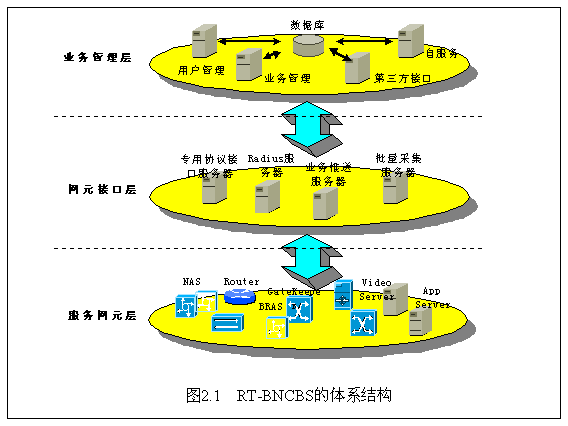 RT-BNCBS管理計費平臺從邏輯上分為三層:服務(wù)網(wǎng)元層、網(wǎng)元接口層和業(yè)務(wù)管理層。如圖1所示。
