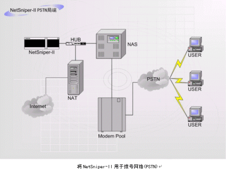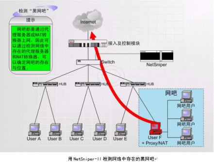 上圖中,NetSniper-II可以對網(wǎng)絡(luò)內(nèi)部各用戶進(jìn)行檢測,一旦發(fā)生某個用戶安裝代理服務(wù)器軟件,其他用戶通過該用戶的接口上網(wǎng)偷逃網(wǎng)費的情況,或發(fā)現(xiàn)盜用MAC地址上網(wǎng)及通過Modem回?fù)苌暇W(wǎng)的情況,NetSniper-II即可定位這些用戶,并且采取通知系統(tǒng)管理員或自動封堵非法用戶等措施。