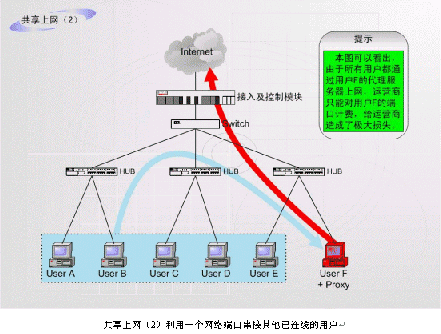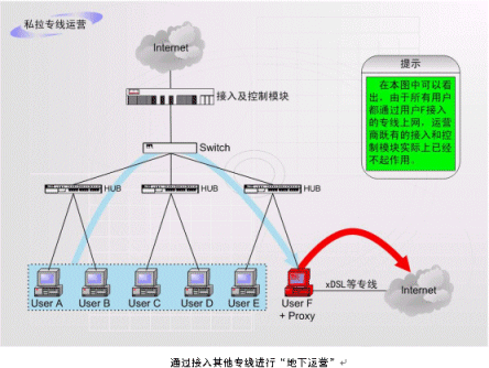 目前所知道的第一種非法運營情況:如上圖中的F用戶合法申請一根ADSL或其他線路然后在自己的計算機中安裝代理服務(wù)軟件或者連接一個路由器,就可以糾集若干住戶分?jǐn)傇搶>的租費,并通過該出口共享帶寬訪問外網(wǎng),而且他們同時還可以享受小區(qū)內(nèi)部網(wǎng)絡(luò)所固有的所有功能。