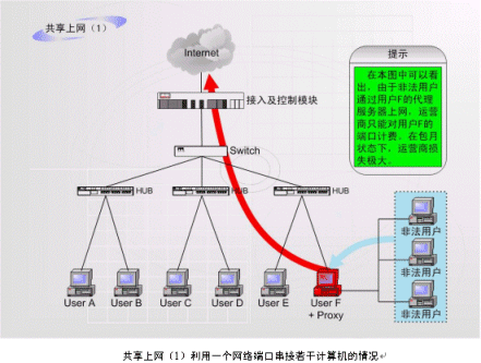 非法運營情況之二:如上圖中的F用戶作為運營商的合法包月用戶,上網(wǎng)服務(wù)開通以后,在自己的計算機中安裝代理服務(wù)軟件或者安裝路由器,這樣就可以隨時糾集若干住戶分?jǐn)偘沦M用,甚至私設(shè)網(wǎng)吧。