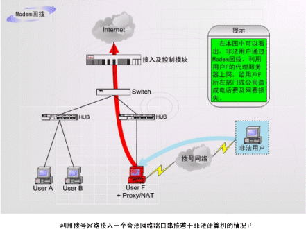 這是在企業(yè)網(wǎng)絡(luò)中常見的情況:如上圖中的F用戶作為企業(yè)的合法用戶,上網(wǎng)服務(wù)開通以后,有操作人員在F計算機中安裝代理服務(wù)軟件、NAT軟件或者安裝路由器軟件,再安裝Modem等遠(yuǎn)程接入設(shè)備。非法用戶在遠(yuǎn)端通過Modem等接入設(shè)備與網(wǎng)絡(luò)相連接。