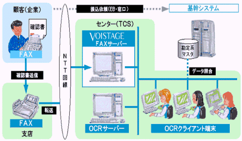 系統(tǒng)結(jié)構(gòu)中心每天收到FAX7~800張?蛻魯(shù)約 1,400家。系統(tǒng)配置是有VOISTAGE(VS-403MC)功能的FAX服務器和OCR