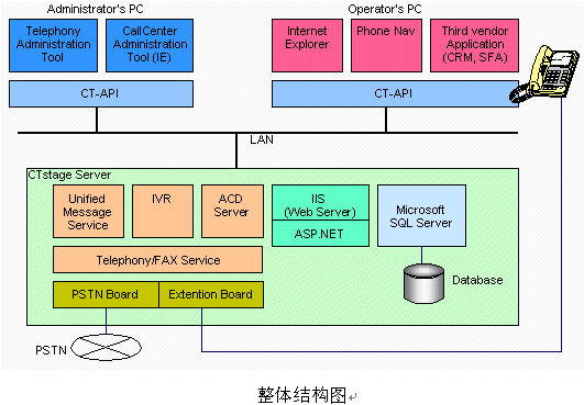 隨著經(jīng)營環(huán)境和企業(yè)環(huán)境的日益激化,作為新時(shí)代的信息策略,計(jì)算機(jī)電話集成(CTI)也由于投資小效益大而倍受注目。沖電氣公司的CTstage實(shí)現(xiàn)最先端的多媒體通信的UnPBX(在服務(wù)器中加插電話板卡,以單臺(tái)計(jì)算機(jī)實(shí)現(xiàn)PBX功能的系統(tǒng))型的開放式CTI系統(tǒng)。在一臺(tái)PC服務(wù)器上實(shí)現(xiàn)IVR和ACD功能、內(nèi)線電話控制、ACD監(jiān)視器等呼叫中心所需要的功能,成為真正意義上的UnPBX呼叫中心。先進(jìn)的CTI的解決方案將作為企業(yè)的經(jīng)營策略,迅速提高適應(yīng)市場的能力。