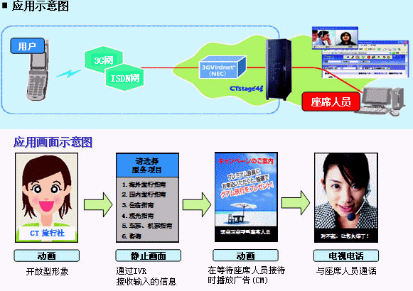 該系統(tǒng)是以OKI的呼叫中心系統(tǒng)"CTstage®4i"為基礎,通過將NEC的視頻解決方案"3GVirdnet®(注1)"與NTTDoCoMo的3G手機"FOMA®"網相連,最終共同構成了可靈活運用"FOMA"電視電話的視頻型呼叫中心系統(tǒng)。這也是日本國內首次開發(fā)成功的視頻型呼叫中心系統(tǒng)。