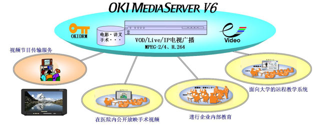 在OKI的通用視頻服務(wù)器系統(tǒng)上,將具有代表性的視頻傳輸功能作為標(biāo)準(zhǔn)服務(wù)要素,以解決方案的形式提供給用戶。以VOD(視頻點(diǎn)播)實(shí)時(shí)傳輸系統(tǒng)、中繼及監(jiān)視系統(tǒng)為代表,可以簡(jiǎn)單便捷構(gòu)筑靈活運(yùn)用視頻及語音的豐富多彩的系統(tǒng)。URL:http://www.oki.com/jp/BMC/。