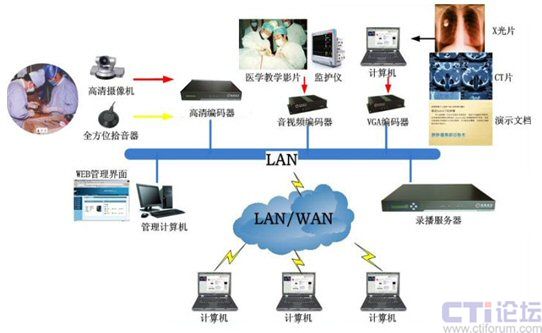 同時(shí),銳取多媒體系統(tǒng)前端VGA編碼器將采集到的計(jì)算機(jī)信號(包含通過網(wǎng)絡(luò)訪問的DR/CR片、CT片)進(jìn)行實(shí)時(shí)編碼和壓縮,通過網(wǎng)絡(luò)與高清視音頻信號以及普通視音頻信號同步傳輸?shù)戒J取多媒體錄播系統(tǒng)遠(yuǎn)程醫(yī)療系統(tǒng)后臺(tái)服務(wù)器上。