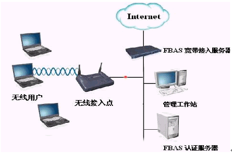 移動用戶通過自身的無線網(wǎng)卡傳遞信息到熱點接收器上,熱點接收器連接到交換機(是為了能具有更好的可拓展性),交換機連接到華夏科技FutureWorks寬帶計費系統(tǒng)的FBAS接入服務(wù)器上,通過接入服務(wù)器連接到INTERNET.這里的FBAS3000系列的寬帶接入服務(wù)器采用的是一體機的模式,接入,認證,計費等一系列服務(wù)均安裝在FBAS里,這樣可以簡化網(wǎng)絡(luò)結(jié)構(gòu)。對FBAS的操作是通過WEB頁面來進行設(shè)置維護的,