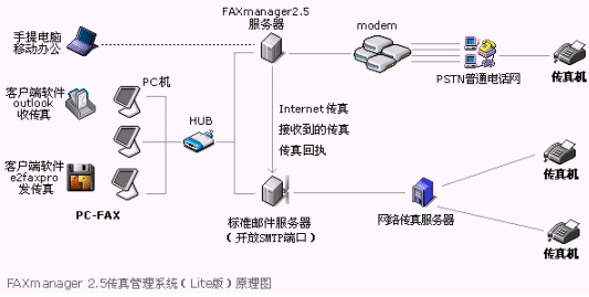 FAXmanager 2.5傳真管理系統(tǒng)安裝在局域網(wǎng)的一臺專用服務器上,運行環(huán)境可以是:Windows98/NT/2000/XP等,此服務器可以同郵件服務器為同一臺機器,構(gòu)成企業(yè)郵件/傳真專用服務器,F(xiàn)AXmanager 2.5可以和企業(yè)郵件系統(tǒng)或群件系統(tǒng)整合使用,可以是Unix/Linux環(huán)境的Qmail和Sendmail等郵件系統(tǒng),也可以是Microsoft Exchange和Lotus Domino/Notes等群件系統(tǒng),當然也可以是IComMail等企業(yè)郵件系統(tǒng),也支持虛擬主機設置企業(yè)郵局開設POP3帳戶和上網(wǎng)代理服務器的使用環(huán)境。