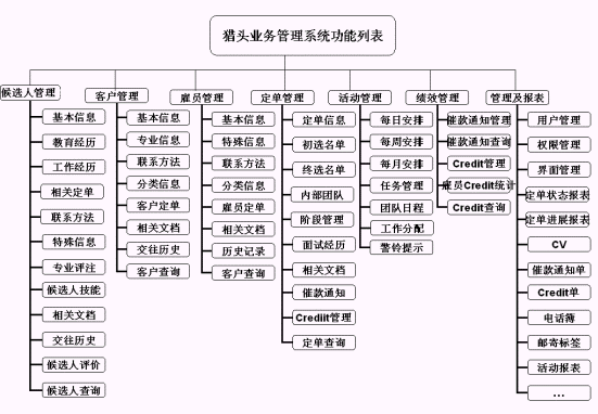 運行于瀏覽器、跨地域信息公享;人力資源信息專業(yè)、覆蓋全面;系統(tǒng)功能強大、操作簡單方便;靈活配置,可擴展性強;復雜的業(yè)務(wù)關(guān)聯(lián)性及專業(yè)的業(yè)務(wù)報表。全部采用模塊化設(shè)置,包含了候選人管理、客戶管理、雇員管理、定單管理、活動管理、績效管理、統(tǒng)計報表和系統(tǒng)維護管理等模塊,以及幾十項具體業(yè)務(wù)功能細節(jié)。系統(tǒng)功能模塊明細表如下: