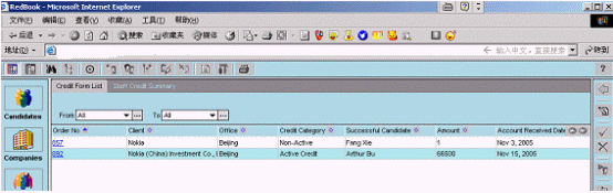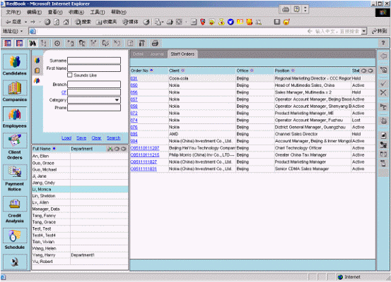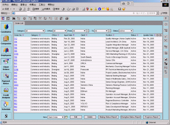 融博獵頭業(yè)務(wù)管理系統(tǒng)已經(jīng)被某著名的獵頭公司正式上線,該系統(tǒng)同時在北京、上海等五個分公司使用。根椐使用客戶反映,該系統(tǒng)功能強大、操作簡單,基本覆蓋了獵頭業(yè)務(wù)的全部內(nèi)容;各種業(yè)務(wù)流程規(guī)范、流暢;各類統(tǒng)計報表靈活、準確;自動生成簡歷、客戶提交報告、催款通知、項目進度報告,極大地提高了企業(yè)的工作效率。該系統(tǒng)與目前國際先進的獵頭公司所使用的系統(tǒng)相比,處于領(lǐng)先的地位。