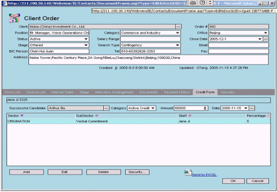 - Credit管理和查詢:根據(jù)雇員定單完成情況,賦予一定比例的傭金提成,自動生成相關(guān)文件,通知財務(wù)等相關(guān)部門和管理者;