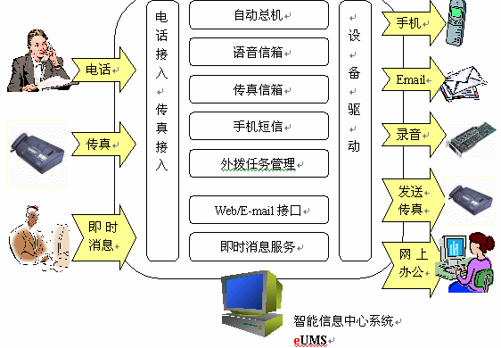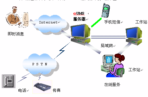 整個系統(tǒng)以eUMS服務(wù)器為核心,對內(nèi)連接企業(yè)局域網(wǎng),對外連接互聯(lián)網(wǎng)。eUMS內(nèi)配置一塊語音/傳真卡,負責(zé)電話、傳真的接入。如果企業(yè)需要自己的短信服務(wù),也可以在eUMS服務(wù)器上安裝手機短信網(wǎng)關(guān),外接一部手機即可。