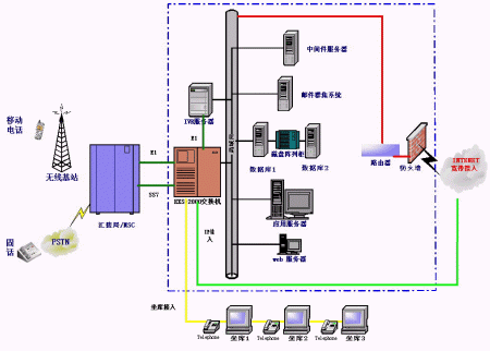 統(tǒng)一通信平臺提供了與企業(yè)內(nèi)部交換機(jī)(PBX)或PSTN,寬帶或INTERNET和GSM或GPRS網(wǎng)絡(luò)的接口,融合了多種網(wǎng)絡(luò)資源和企業(yè)內(nèi)部數(shù)據(jù)源。為用戶提供了多種服務(wù)界面:WEB界面、人工服務(wù)界面,IVR界面。同時為用戶提供短信息等數(shù)據(jù)業(yè)務(wù)。