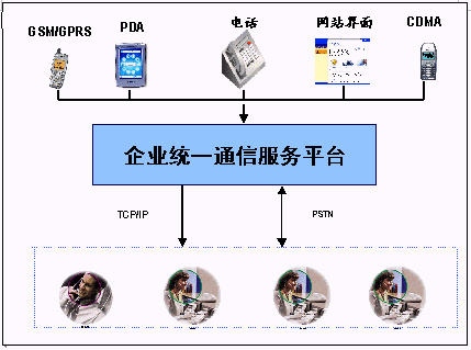 企業(yè)統(tǒng)一通信平臺提供了多種接入方式:人工坐席接入、自動語音IVR、GPRS、WAP接入、寬帶接入、短信息接入;同時還提供了多種信息發(fā)布方式: