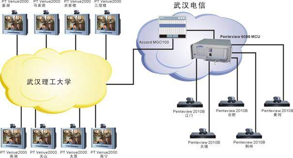 武漢理工大學(xué)的遠(yuǎn)程教學(xué)系統(tǒng)由于分3期建設(shè),網(wǎng)絡(luò)條件較為復(fù)雜。一期主要以PT的Venue2000終端+Accord MGC100 MCU為主,是一個(gè)H323系統(tǒng);二、三期采用中太多媒體的Penteview2010終端+Penteview6088MCU,是一個(gè)H320系統(tǒng),兩套系統(tǒng)通過網(wǎng)關(guān)無縫結(jié)合到一起工作,用戶根本感覺不到不同。各教室均同時(shí)采用了中太多媒體的遠(yuǎn)程教學(xué)支撐系統(tǒng),通過對Penteview會議電視系統(tǒng)的擴(kuò)充,實(shí)現(xiàn)了以下功能,使教學(xué)應(yīng)用更加方便: