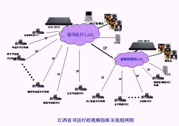 江西司法視頻會議系統(tǒng)的拓撲結構如圖所示。整個視頻會議系統(tǒng)為星型拓撲結構,其中二級網以省司法廳和省監(jiān)獄管理局為主會場,放置2個MCU;另外,包括11個地市司法局的分會場(南昌、九江、贛州、吉安、撫州、鷹潭、萍鄉(xiāng)、新余、上饒、景德鎮(zhèn)、宜春),14個監(jiān)獄和農場分會場,傳輸網絡為2M IP網絡,視頻會議協(xié)議為H.323;司法局和監(jiān)獄管理局也可以單獨成網,在分別依托省司法廳和省監(jiān)獄管理局MCU的情況下,各地市司法局或監(jiān)獄系統(tǒng)可與省司法廳或省監(jiān)獄管理局單獨進行雙向的視頻會議,整個系統(tǒng)具有很強的靈活性和擴展性。