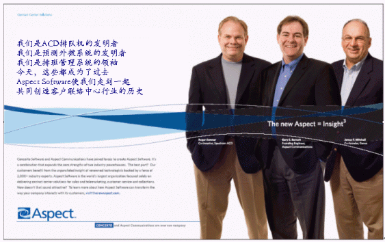 我們可以看到全新的Aspect Software將會給我們的客戶、合作伙伴以及我們的員工帶來更大的利益,我們擁有廣泛的解決方案、強(qiáng)大的研發(fā)團(tuán)隊(duì)以及支持隊(duì)伍,Aspect將會緊密地與您合作,在發(fā)展和實(shí)施呼叫中心解決方案的同時(shí)持續(xù)給您的業(yè)務(wù)帶來新的價(jià)值。