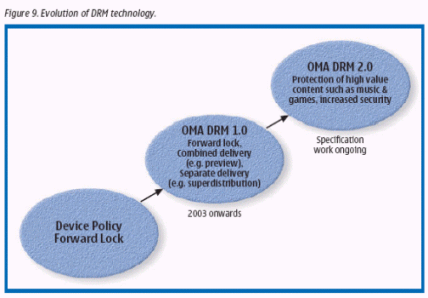 新的OMA MMS 1.0版本標(biāo)準(zhǔn)會(huì)給出移動(dòng)中心內(nèi)容類型(無論是通過WAP下載或MMS接收的)的使用規(guī)則。這事國(guó)際上首次真正公開DRM標(biāo)準(zhǔn),并且在2002年10月正式獲得官方認(rèn)可。