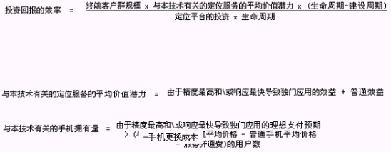 主要的因素有:終端客戶群的規(guī)模、定位平臺的投資、建設(shè)周期,請看下列公式(未經(jīng)實際統(tǒng)計驗證,僅僅用于估算):