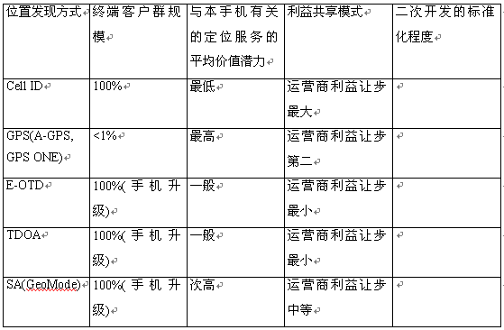 根據(jù)位置發(fā)現(xiàn)策略的不同,已經(jīng)有很多的成熟技術(shù)可選---Cell ID、GPS(A-GPS = GPS + Cell ID)、TDOA/E-OTD/TDOA、SA(信號衰減,
