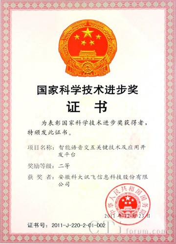 CTI論壇(ctiforum)2月20日消息(記者 浩宇):2月14日,2011年度國家科學(xué)技術(shù)獎勵大會在北京隆重舉行,黨和國家領(lǐng)導(dǎo)人胡錦濤、溫家寶、李長春、李克強(qiáng)出席大會并為獲獎代表頒獎。由科大訊飛和中國科學(xué)技術(shù)大學(xué)聯(lián)合提交的“智能語音交互關(guān)鍵技術(shù)及應(yīng)用開發(fā)平臺”項(xiàng)目榮獲國家科技進(jìn)步二等獎,在本年度信息化領(lǐng)域(計(jì)算機(jī)與自動控制、通信、現(xiàn)代服務(wù)業(yè)信息化等專業(yè)組)一等獎空缺的情況下,該項(xiàng)目在計(jì)算機(jī)與自動控制專業(yè)組所有項(xiàng)目中排名第一。這是科大訊飛第二次獲得這一國家獎重大榮譽(yù),也是語音產(chǎn)業(yè)界唯一獲此殊榮的企業(yè)。