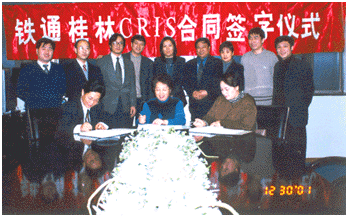 桂林CRIS項目經(jīng)過多方面的努力,2001年12月30日在中鐵網(wǎng)絡公司,舉行了由中鐵網(wǎng)絡公司、北京佳訊飛鴻信息技術有限公司和桂林訊聯(lián)科技有限公司三方代表參加的鐵通桂林CRIS項目合同簽約儀式。