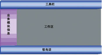 軟電話提供標(biāo)準(zhǔn)的呼叫控制功能,如座席的登錄、注銷等。業(yè)務(wù)模塊信息根據(jù)該座席的技能設(shè)置顯示該座席能夠使用的座席業(yè)務(wù)模塊,工作區(qū)是座席使用業(yè)務(wù)模塊的區(qū)域,業(yè)務(wù)模塊的調(diào)入可以是系統(tǒng)根據(jù)自動服務(wù)傳遞的參數(shù)自動彈出,也可以是座席人員手工選擇相應(yīng)的業(yè)務(wù)操作。同時,業(yè)務(wù)模塊通過標(biāo)準(zhǔn)的接口和軟電話模塊進行通信,取得或者設(shè)置系統(tǒng)的呼叫參數(shù)或操作,包括提取系統(tǒng)主被叫號碼、用戶按鍵等。通過工具欄提供系統(tǒng)的菜單、快捷鍵、快捷按鈕的使用。通過這種方式,系統(tǒng)可以隨時增加、修改座席的業(yè)務(wù)模塊,而無須修改整個座席端,有利于系統(tǒng)業(yè)務(wù)的分步實施,大大縮短了系統(tǒng)的整個建設(shè)周期。