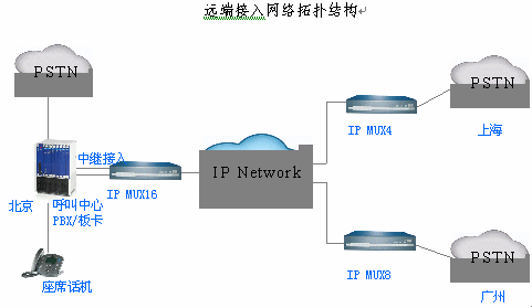 遠端接入:根據(jù)實際遠端中繼數(shù)量,選擇IP MUX4/8/16網(wǎng)關,通過環(huán)路中繼接口連接本地的電信網(wǎng);