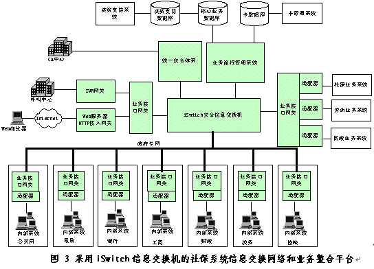 采用iSwitch安全信息交換機的社保系統(tǒng)信息交換網(wǎng)絡和業(yè)務整合平臺如圖3所示。