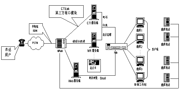 企業(yè)級(jí)統(tǒng)一消息平臺(tái),它將交換技術(shù)、CTI技術(shù)、INTERNET技術(shù)合理地應(yīng)用到系統(tǒng)中,包含了基于數(shù)據(jù)庫(kù)的智能化呼叫分配(ACD)、交互式語音應(yīng)答(IVR)、傳真服務(wù)器(Fax