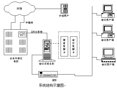 說明:如果沒有企業(yè)內(nèi)部程控交換機則可以將中繼線直接接在會議系統(tǒng)主機上,中繼線可以是普通模擬中繼,也可以是E1接口(如中國一號信令、30B+D等)。在與會議系統(tǒng)主機的同一網(wǎng)段上可以配置多個會議客戶端系統(tǒng),通過客戶端系統(tǒng)用戶可以隨時觀察和監(jiān)視會議系統(tǒng)的使用情況,并且可以建立常用用戶的用戶資料,也可以對常用用戶進(jìn)行分組,這樣要呼叫某些用戶開會時只需呼叫組用戶即可;