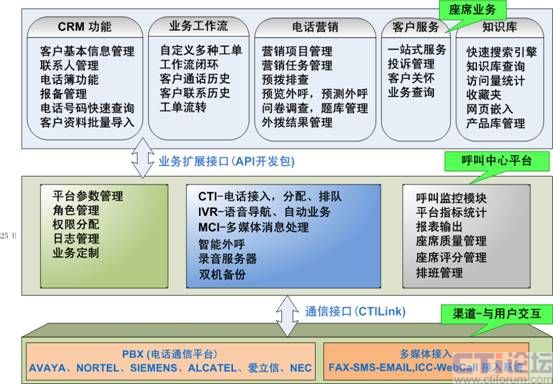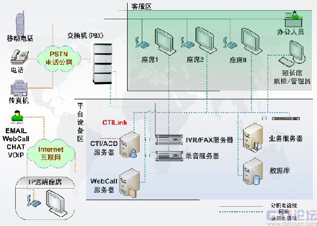 呼叫中心通信平臺,包含了交換機(PBX)、CTI服務(wù)器、IVR服務(wù)器、傳真服務(wù)器、全程錄音設(shè)備等幾個部分,是客服中心實施的基礎(chǔ)。