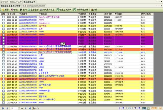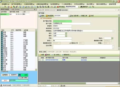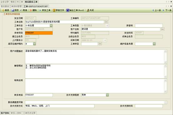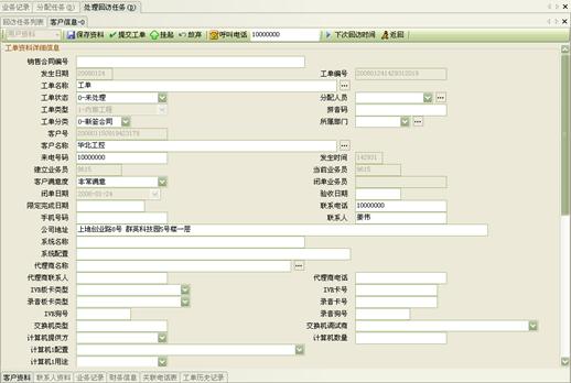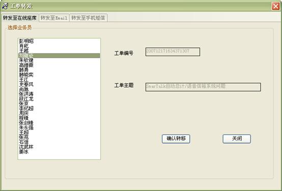 3) 工作流閉環(huán)、客戶(hù)通話(huà)歷史,客戶(hù)聯(lián)系歷史,工單流轉(zhuǎn):工作流系統(tǒng)是通過(guò)工單實(shí)現(xiàn)各工作流環(huán)節(jié)的聯(lián)系以及工作流的定義管理,工作流狀態(tài)查詢(xún)、更改的。操作員可根據(jù)用戶(hù)的不同業(yè)務(wù)請(qǐng)求,建立相應(yīng)的工單記錄,并對(duì)該事后處理過(guò)程進(jìn)行跟蹤;也可對(duì)要處理的事務(wù)形成工單轉(zhuǎn)給相應(yīng)的操作員,并跟蹤該工單的處理過(guò)程;可定期提示操作員處理要過(guò)期的工單,以提高服務(wù)質(zhì)量;每次處理過(guò)程都會(huì)有詳細(xì)的記錄,以便統(tǒng)計(jì)查詢(xún) 。如圖8、9、10: