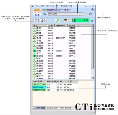 辦公人員可以通過時實電話的界面:實時監(jiān)控系統(tǒng)的呼叫隊列、其它辦公人員的工作狀態(tài);并且通過屏幕控制電話的接答、掛機、轉接,以及建立會議等操作。如下圖所示: