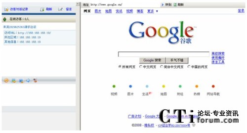 在客服人員與網站訪客聊天的過程中,可以通過“網頁同步”,使網站訪客的電腦上自動彈出與客服人員同樣的網頁(如下圖:網站訪客的電腦上自動彈出www.google.com的網站)。