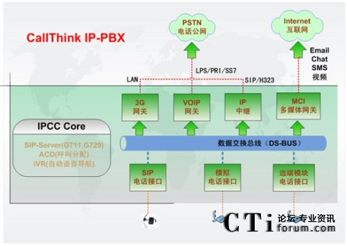 IPCC Core是IP-PBX的核心部分,提供了配置IP分機號碼(Extension Number)、功能按鈕以及通話管理和ACD路由策略功能;它可以支持多達1000個IP語音終端呼叫請求,通過分組交換,實現IP分機、普通分機、互聯(lián)網上IP電話之間的互聯(lián)互通;通過Voip網關,可以實現IP網絡和傳統(tǒng)電路交換電話網的通信,完成異種網絡的電話呼入和呼出;