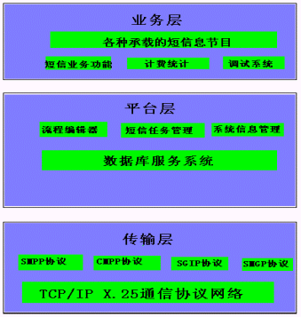3、 傳輸層:主要完成與聯(lián)通、移動和網(wǎng)通等公司的網(wǎng)絡(luò)傳輸,本系統(tǒng)支持多種傳輸協(xié)議,SMPP協(xié)議,CMPP協(xié)議、SGIP協(xié)議和SMGP協(xié)議。