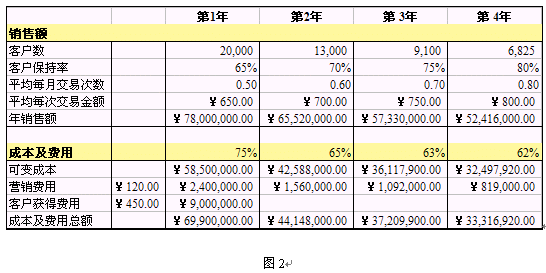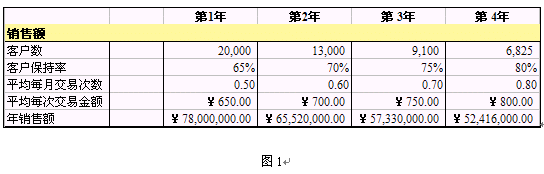 = ¥78,000,000.00。隨著時(shí)間的推移,保留下來(lái)的老客戶(hù)平均每個(gè)月的交易次數(shù)逐步從0.50次上升到0.80次,而且每次采購(gòu)的金額也逐步從¥650.00提高到¥800.00;但是由于這一組客戶(hù)的數(shù)量不斷減少,年銷(xiāo)售額逐步從¥78,000,000.00下降到了¥52,416,000.00。