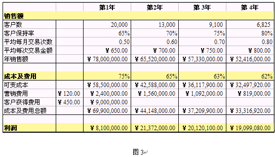 如圖3所示,將各年的銷(xiāo)售額分別減去成本及費(fèi)用,就得到各年度的利潤(rùn)額。我們發(fā)現(xiàn)這一組客戶(hù)貢獻(xiàn)的利潤(rùn),從第1年的¥8,100,000.00到第2年的¥21,372,000.00,有顯著上升;利潤(rùn)在第2年達(dá)到頂點(diǎn)后,逐年緩慢下降,下降的幅度比較小。