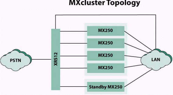 為支持冗余配置蘇迪思科技公司同時推出新產(chǎn)品XRS12物理連接轉(zhuǎn)換開關(guān)。XRS12可被安裝在19英吋的機架上,并將占用機架中的1RU單元。MXcluster集群中每一臺MX250上的PSTN線路均通過XRS12連接至PSTN網(wǎng)絡(luò)。當某一臺MX250出現(xiàn)故障時,XRS12自動將與該臺MX250對應(yīng)的PSTN網(wǎng)絡(luò)線路轉(zhuǎn)接至備份MX250上。使用XRS12,無需管理員介入操作,即可實現(xiàn)MXcluster集群與PSTN的不間斷連接。