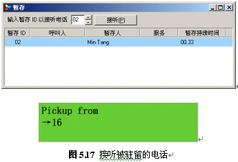 接通后,如果通話內(nèi)容很緊急而又不方便在會議室進行溝通,此時,用戶可以按下話機上的“Park”按鈕,此時對方通話被導入到一段音樂(背景音中設定的音樂)。記住屏幕上提示的駐留號碼,即可掛機:
