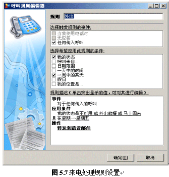 用戶可以設置一個或多個來電處理規(guī)則,來電處理規(guī)則能夠協(xié)助用戶處理來電,讓客戶得到最好的電話支持或服務。我們可以這么使用此功能,如:外出時將所有來電轉(zhuǎn)至語音信箱,節(jié)假日時將電話轉(zhuǎn)至手機等。