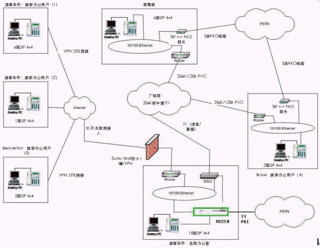 系統(tǒng)的安裝是由蘇迪思科技公司的認證增值分銷商Xiologix 來實現(xiàn)的。在45分鐘內(nèi)Xiologix 的工程師就設(shè)定和調(diào)試完畢MX250并且完成了第一期20部蘇迪思ZIP4x4 IP電話的安裝。一個月后Consani Associates公司又進行了系統(tǒng)擴展追加了30個用戶許可和另外30部ZIP4x4 IP電話。Consani Associates 公司采用蘇迪思科技的MX250系統(tǒng)后的公司系統(tǒng)網(wǎng)絡拓樸圖如下:
