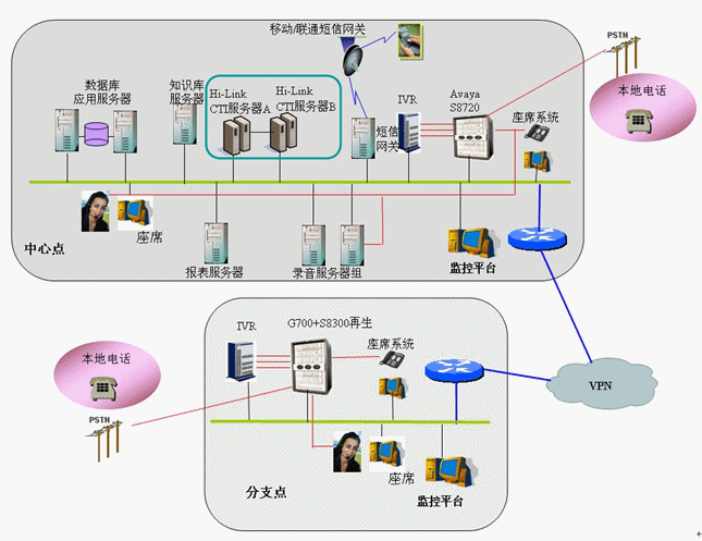 整個網(wǎng)路可以劃分為Internet接入部分、電話接入部分、CTI系統(tǒng)內(nèi)網(wǎng)、辦公網(wǎng)絡和座席系統(tǒng)5個部分。Internet接入部分實現(xiàn)網(wǎng)絡訪問的受理和轉(zhuǎn)發(fā);電話接入部分完成電話語音和傳真的接續(xù)和處理;CTI系統(tǒng)內(nèi)網(wǎng)完成電話呼叫的控制和應用的集成;座席系統(tǒng)部分完成語音和控制信息的接收和處理,為座席提供通話能力和業(yè)務處理能力。