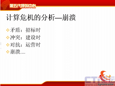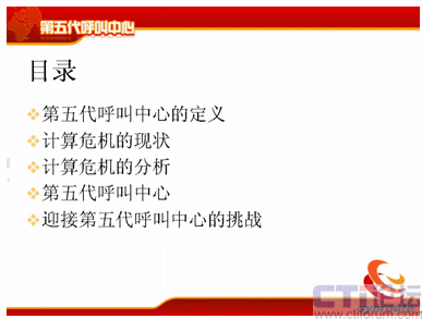 我把第五代呼叫中心的概念詳細(xì)地論述一下。主要是分成五個部分,第一個是第五代呼叫中心的定義;第二個計算危機的現(xiàn)狀;第三是計算危機的分析;第四第五代呼叫中心;第五是結(jié)論——迎接第五代呼叫中心的挑戰(zhàn)。